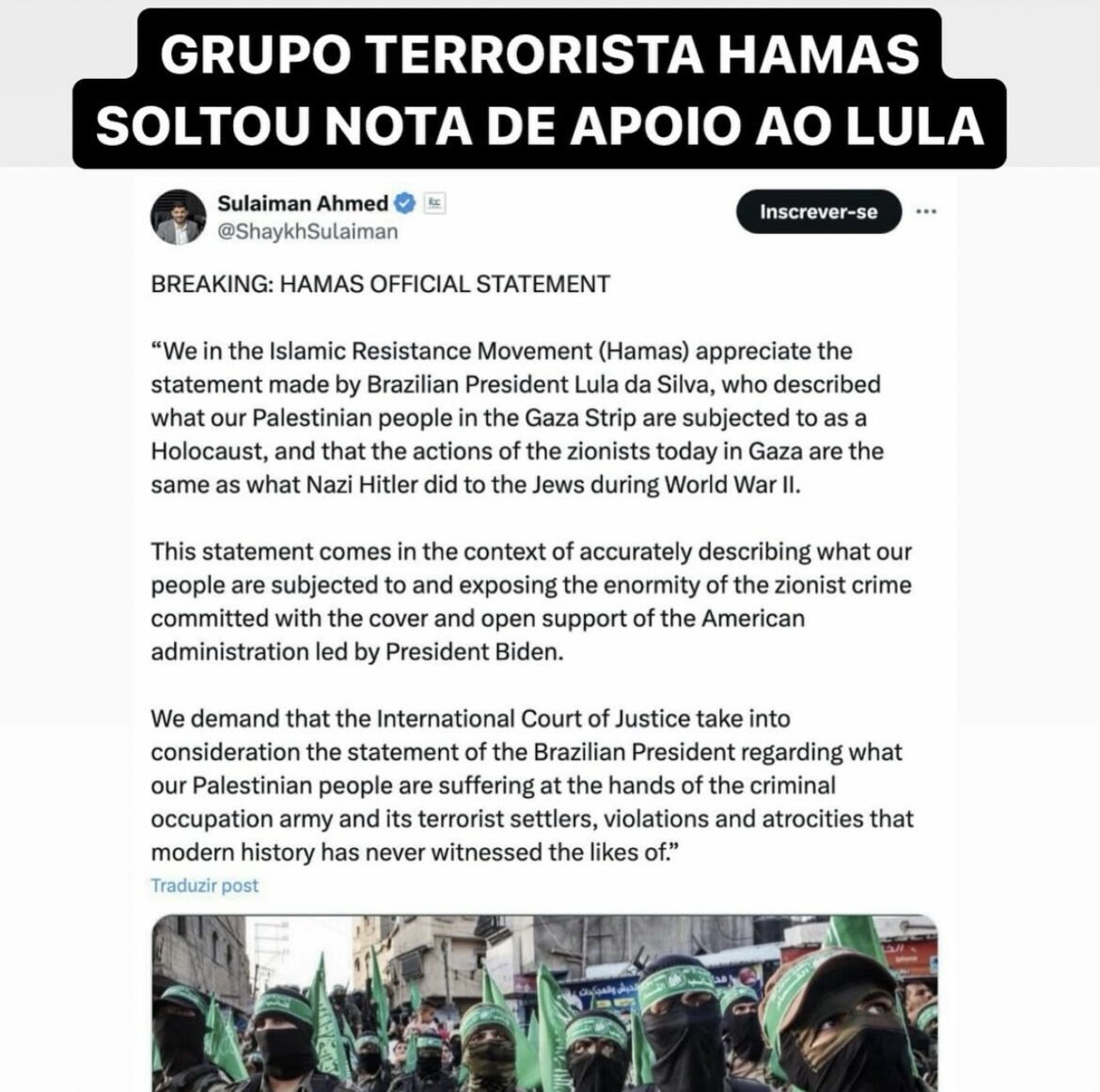 “Nós, no Movimento de Resistência Islâmica (Hamas), apreciamos a declaração do Presidente brasileiro Lula da Silva, que descreveu aquilo a que o nosso povo palestino está a ser submetido na Faixa de Gaza como um Holocausto, e que o que os sionistas estão a fazer hoje em Gaza é o mesmo como o que Hitler nazista fez aos judeus durante a Segunda Guerra Mundial.