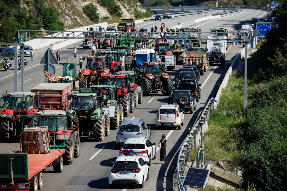 Em um esforço coordenado, agricultores espanhóis e franceses bloquearam a fronteira entre Espanha e França com cerca de uma centena de tratores, obstruindo sete pontos de passagem principais, desde a região basca até a Catalunha.