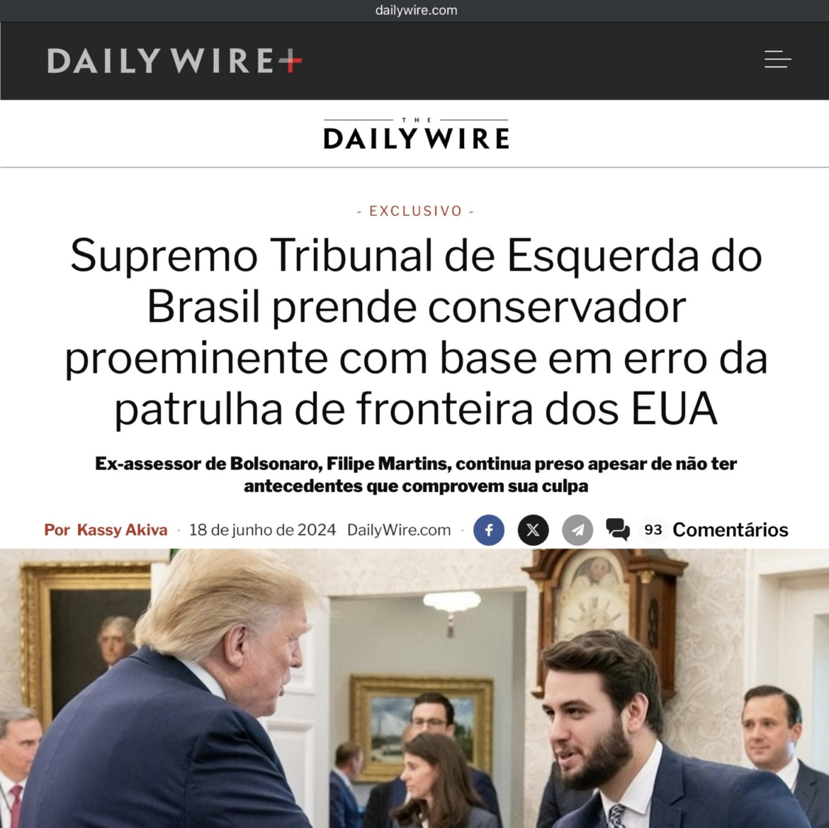 O Daily Wire destacou que “a prisão prolongada ocorre no momento em que o STF enfrenta críticas generalizadas por extrapolar sua autoridade para punir opositores. Ele [Filipe Martins] ainda não foi julgado e segue preso sob o argumento de que há risco de fugir do país, apesar das correções. Seus advogados dizem que o governo o prende por motivos políticos.”