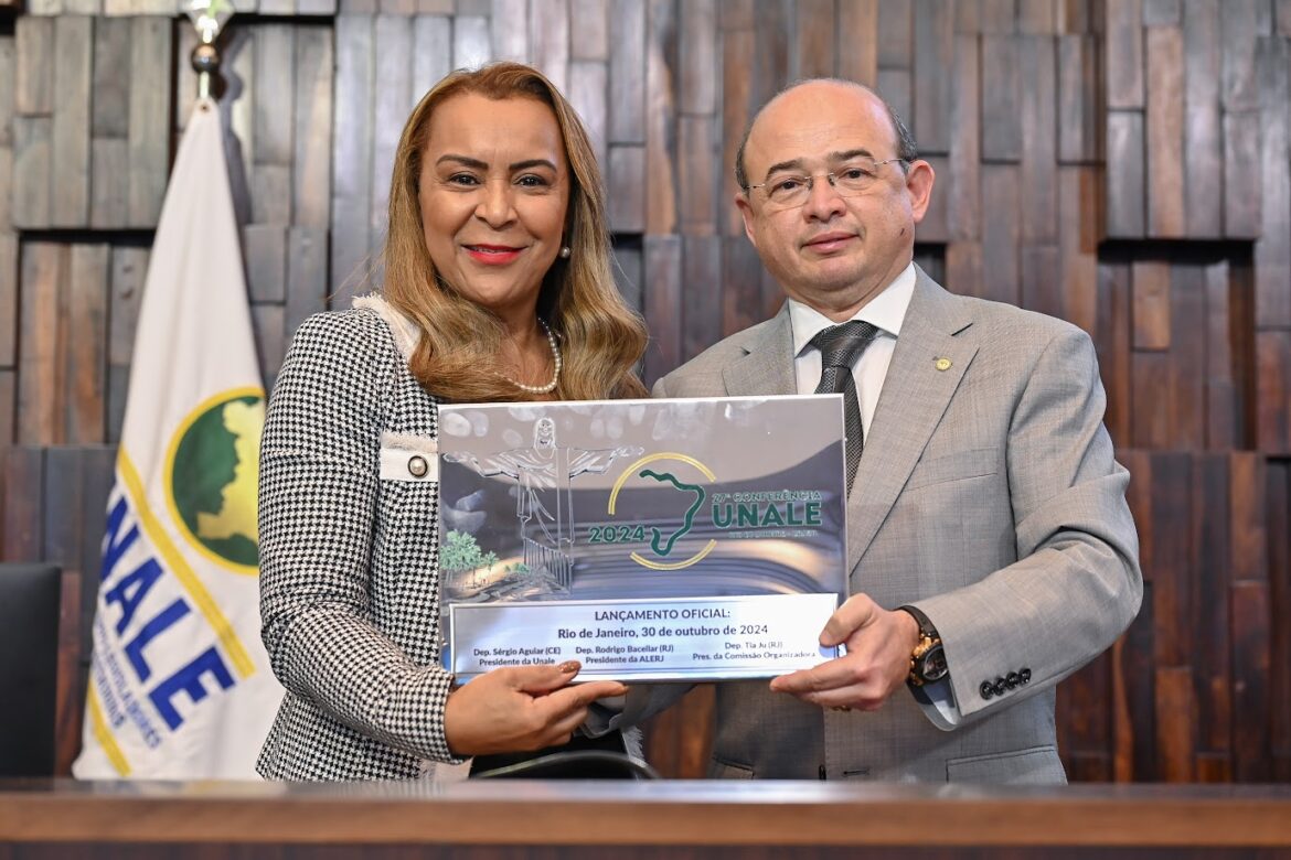 A Assembleia Legislativa do Estado do Rio de Janeiro (Alerj) realizou, nesta quarta-feira (30/10), solenidade de lançamento da 27ª Conferência da União Nacional dos Legisladores e Legislativos Estaduais (Unale). A cerimônia aconteceu no Plenário do Edifício Lúcio Costa, sede do Parlamento fluminense, e contou com a presença de uma comitiva de deputados de outros estados integrantes da Unale. Durante o evento, a deputada da Alerj Tia Ju (Rep), que preside a Comissão Organizadora, recebeu do presidente da Unale, deputado Sérgio Aguiar (CE), uma placa que marca a edição deste ano, a ser realizada nos dias 3, 4 e 5 de dezembro, na cidade do Rio de Janeiro, com o tema “O Futuro da Educação no Brasil”.